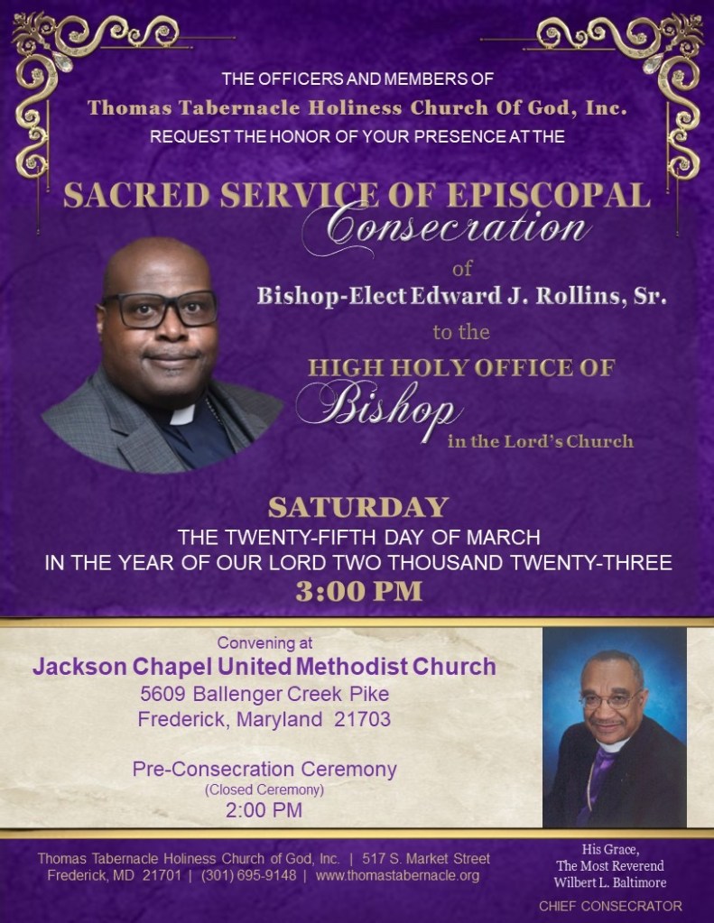 It would be our honor if you would join us for this special event for Bishop-Elect Edward J. Rollins, Sr. for his Sacred Service of Episcopal Consecration to the high holy office of Bishop in the Lord’s Church. We look forward to celebrating together on this momentous occasion.